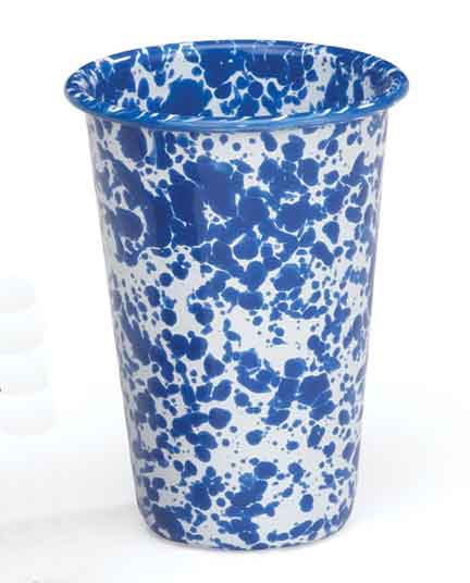 Set of four 14 oz. Crow Canyon Home Blue Marble tumblers. 4.5" Tall with a 3.5" Diameter at the top. Made from carbon steel coated with porcelain enamel in a two coat process that results in a slightly textured surface. Because of this process, each tumbler is unique in color coverage and patterns.The rim of the tumbler is curled. Oven and dishwasher safe. Do not leave is standing water. Dry promptly.