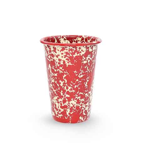 Set of four 14 oz. Crow Canyon Home Burgundy on Cream Marble tumblers. 4.5" Tall with a 3.5" Diameter at the top. Made from carbon steel coated with porcelain enamel in a two coat process that results in a slightly textured surface. Because of this process, each tumbler is unique in color coverage and patterns. The rim of the tumbler is curled. Oven and dishwasher safe. Do not leave is standing water. Dry promptly.
