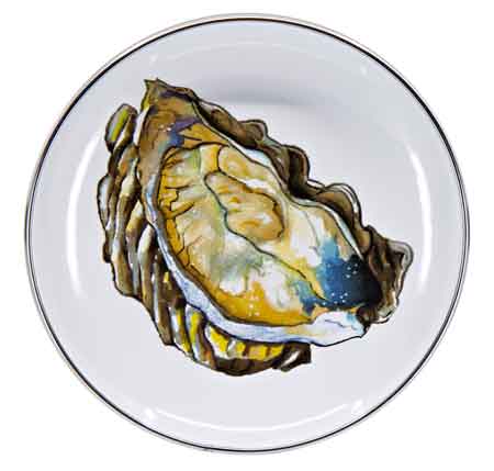 One Golden Rabbit Enamelware 5.75" Oyster Collection Bread & Butter Plate. 5.75" diameter Golden Rabbit bread & butter plate is great for toast, pastries, or cake & desserts! Durable enough to use every day! Stainless steel rim for extra durability. The graphic designs on Golden Rabbit enamelware are fused into the enamel during the firing process and are covered with glass fritz that gives the piece a protective surface as well as a high gloss finish.. Dishwasher and oven safe. Not intended for microwave use. Do not soak. Dry promptly. Made in Indonesia.