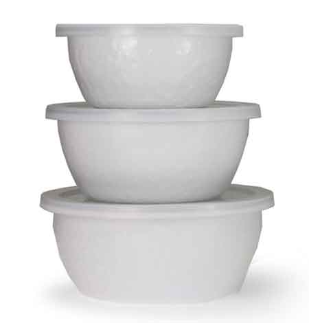 Set of 3 enamelware nesting storage bowls with plastic lids and stainless steel rims from Golden Rabbit. Bowl sizes: 6", 7", 7.5". Capacity for the bowls is 3 cups, 4 cups, and 6 cups.