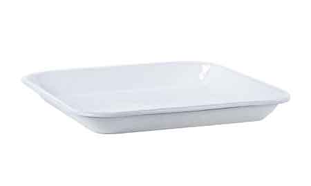 One Golden Rabbit Enamelware 10.5" square tray or baking sheet with rolled edges.Golden Rabbit enamelware rolled edge products are handcrafted in China where porcelain enamels are fused onto carbon steel at very high temperatures. The two coat process results in a slightly textured surface. In terms of durability, Golden Rabbit enamelware holds up to oven, stove-top and even broiler heat, as well as freezer storage. It is dishwasher safe, but is not intended for microwave use.