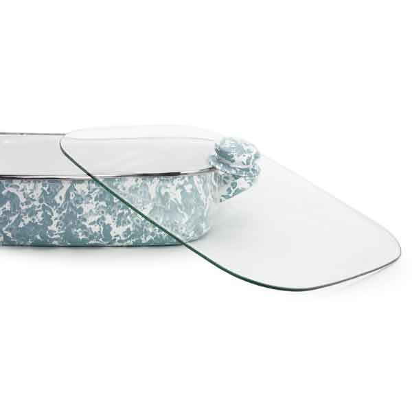 Golden Rabbit enamelware Lasagna baking pan with stainless steel rim and glass lid. This is a large, deep baking pan with a 10.5 quart capacity. The pan measures 16.75"L X 12.5"W X 3.75"H. Overall length with the handles is 19". Two 4" wide handles on the short ends of the pan. The glass lid measures 16.25"L X 12"W and has a large 2.25" diameter enameled knob that coordinates with the color of the pan. Golden Rabbit enamelware is manufactured in Indonesia and has a steel core with a porcelain coating done in a two coat process that results in a slightly textured pattern. All pieces are hand finished and are unique in pattern and coverage. Oven and dishwasher safe. Enamelware is not intended for microwave use.
