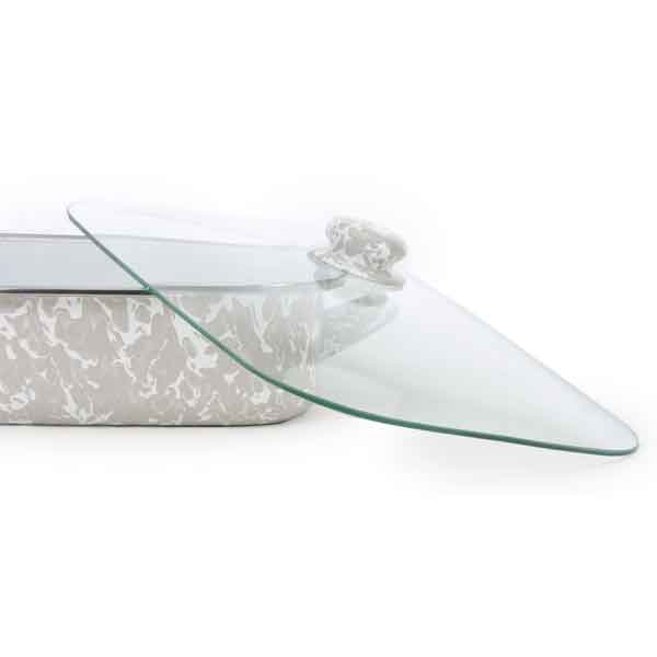 Golden Rabbit Taupe on White enamelware Lasagna baking pan with stainless steel rim and glass lid. This is a large, deep baking pan with a 10.5 quart capacity. The pan measures 16.75"L X 12.5"W X 3.75"H. Overall length with the handles is 19". Two 4" wide handles on the short ends of the pan. The glass lid measures 16.25"L X 12"W and has a large 2.25" diameter enameled knob that coordinates with the color of the pan.Golden Rabbit enamelware is manufactured in Indonesia and has a steel core with a porcelain coating done in a two coat process that results in a slightly textured pattern. All pieces are hand finished and are unique in pattern and coverage.Oven and dishwasher safe.Enamelware is not intended for microwave use.