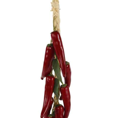 One braided strand of approx 16 artificial red chili peppers. Measures 18" long. Perfect for vegetable arrangements or kitchen displays! For decorative use only.