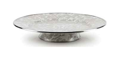 Golden Rabbit Enamelware Taupe Swirl Cake or Dessert Serving PlatePedestal style server stands 2.25" tall and has a 12.5" diameter with welled center and stainless steel rim on the plate and the base. The two coat process results in a slightly textured surface.Color coverage and patterns will vary, making each individual piece unique!This enamelware is made of carbon steel coated with porcelain enamel. Dishwasher safe, but dry promptly. Do not wash with hard water softeners or lemon based detergents- this will affect the finish. Do not soak. Enamelware is naturally non-stick and washes up with little effort. Do not use abrasives or scratch pads.Enamelware should not be used in the microwave.Made in Indonesia.