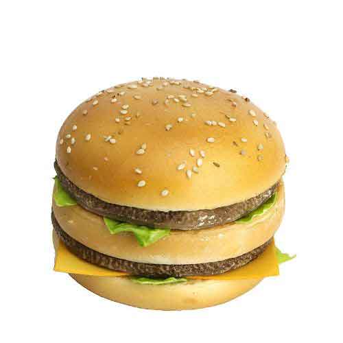 Artificial Double Hamburger with Cheese and Lettuce.Two Hamburger patties with lettuce and 1 piece of cheese on a sesame seed bun. Measures 2.75" high X 3.5" Diameter. Soft and realistic. Top and 2 bottom buns included. One piece, does not disassemble. For decoration only.