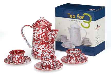 Tea Set, Childrens Red Marble Enamelware, 7 Piece