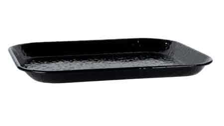 One Golden Rabbit Enamelware 12.5" X 16" half sheet tray or baking sheet with rolled edges and slightly sloping sides.Golden Rabbit enamelware rolled edge products are handcrafted in China where porcelain enamels are fused onto carbon steel at very high temperatures. The two coat process results in a slightly textured surface. In terms of durability, Golden Rabbit enamelware holds up to oven, stove-top and even broiler heat, as well as freezer storage. It is dishwasher safe, but is not intended for microwave use.