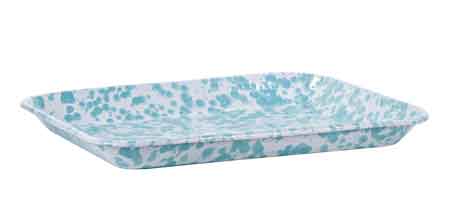 Set of 2 Golden Rabbit Enamelware 10" X 13" sheet trays or baking sheets with rolled edges and slightly sloping sides.Golden Rabbit enamelware rolled edge products are handcrafted in China where porcelain enamels are fused onto carbon steel at very high temperatures. The two coat process results in a slightly textured surface. In terms of durability, Golden Rabbit enamelware holds up to oven, stove-top and even broiler heat, as well as freezer storage. It is dishwasher safe, but is not intended for microwave use.
