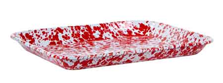 Set of 2 Golden Rabbit Enamelware 10" X 13" sheet tray or baking sheet with rolled edges and slightly sloping sides.Golden Rabbit enamelware rolled edge products are handcrafted in China where porcelain enamels are fused onto carbon steel at very high temperatures. The two coat process results in a slightly textured surface. In terms of durability, Golden Rabbit enamelware holds up to oven, stove-top and even broiler heat, as well as freezer storage. It is dishwasher safe, but is not intended for microwave use.