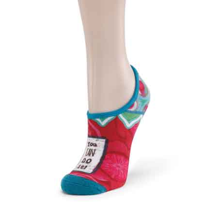 You Can Do It Women's Footie Socks. Oversized bright floral design with text block. One size fits most. Measures 3.5"W X 8"H. Cotton, polyester, and nylon. Machine washable, tumble dry.