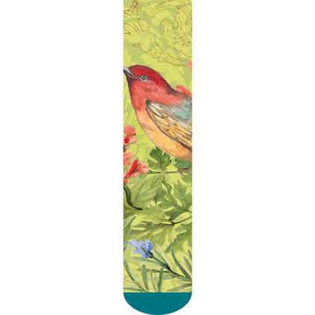 Soul To Sole Bird Ladies Mid-Calf Socks, one pair. Designed by Susan Winget. Colorful bird on a colorful background. Made with art & soul and extra padding to make you feel good from your soul to your soles! One size fits most, women's mid-calf socks. 90% Polyester, 7% Nylon, 1.8% Spandex and 1.2% Rubber. Machine washable, delicate, tumble dry low. 3.25" X 8"H.