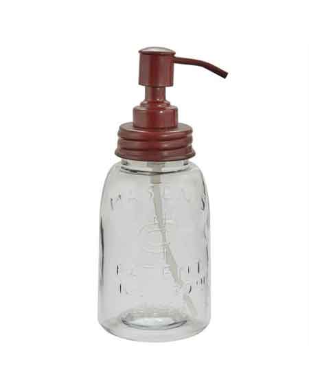 Park Designs Mason Jar Soap or Lotion Dispenser. Ideal for liquid soaps or lotion. Add personality to any sink setting whether in the bath, utility room or kitchen! Resin housing with plastic and red metal pump assembly. 8"H X 3.25"D.