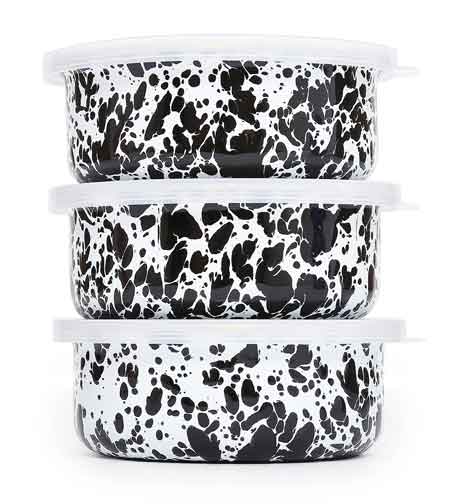 Crow Canyon Home Enamelware set of 3 enamelware bowls with plastic lids and stainless steel rims. They are a perfect size for storing leftovers, or carrying snacks! The bowls are 2" tall with a 5" diameter and hold approx 12 ounces. Many colors to choose from.