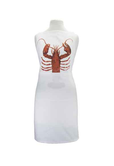 Golden Rabbit Red Lobster Kitchen Apron. 100% cotton. Made in India. One size. Large front pocket. Adjustable neck strap. Approx. 33" in length. Machine washable, tumble dry low. Part of Golden Rabbits Lobster Collection of enamelware and kitchen linens.