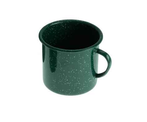 Classic graniteware green enamelware 12 oz. cup. Resembles traditional graniteware in classic speckled design of solid green with tiny white specks. Scratch and chip resistant. From GSI Outdoors. Made from carbon steel coated with porcelain enamel. Heat resistant handle design. Oven and dishwasher safe. Do not leave in standing water. Enamelware is not intended for microwave use. Large quantities should ordered in multiples of 24.