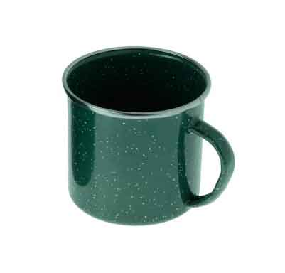 Stainless Steel Rim Green Cup, 12 oz capacity. Resembles traditional graniteware in classic speckled finish with a solid green color and tiny white specks. Chip and scratch resistant. From GSI Outdoors enamelware collection. Made from steel coated with porcelain enamel. Oven and dishwasher safe. Do not leave in standing water. Enamelware is not intended for microwave use. 4.4" X 3.5" X 3.0" Weight: 4.4 oz.