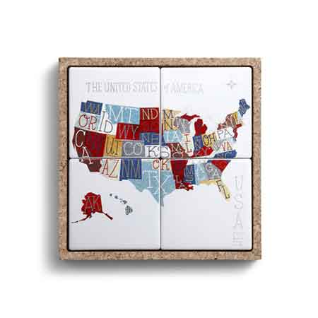 Demdaco United States Map Coaster Set in a Cork Tray.9" square cork tray holds the 4 earthenware coasters when not in use. Considered a 3-in-1 set, the cork tray can be used as a serving trivet, 4 individual coasters, and decorative table art! The 4" square coasters have a ceramic finish and cork backing. To clean, wipe with a damp cloth.