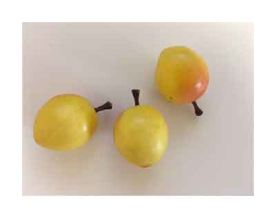 One bag of 48 miniature yellow Nectarines with blush. These tiny miniature fruits measure 7/8 inch in size, with stem 1 1/8". The tiny fruits have a slightly pointed bottom and a side crease like the real fruits. The nectarines range from light yellow to a rosy blush near the stem on one side. Perfect for crafts and jewelry projects. Made from polyfoam.