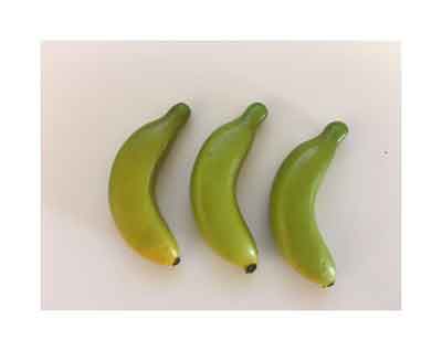 One bag of 48 miniature artificial green bananas. Perfect for craft projects, jewelry making, and more! The fruits measure 1.75" in size. Green coloring with a yellow blush. Made from extruded polyfoam in China.