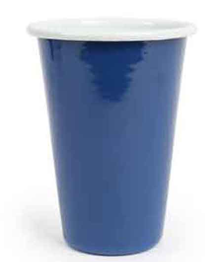Crow Canyon Home enamelware Pacifica Collection 14 ounce enamelware medium blue tumbler is the perfect accessory for enamelware dinnerware at home, picnic, backyard, or campsite! 4.75" tall with 3.5" diameter at the top and a 2" diameter at the bottom. The top edge is curled. High quality steel construction with a baked enamel finish. The bowl is blue on the outside and white on the inside.. Easy to clean. Durable enough for every day use. Oven and dishwasher safe. Do not soak. Dry promptly. Enamelware is not intended for microwave use.