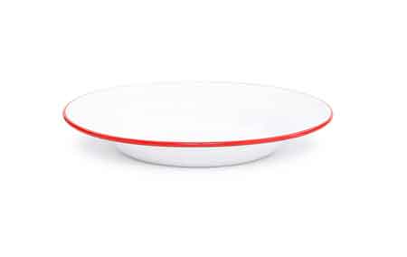 Crow Canyon Enamelware Vintage Style Red Rim 8" Salad. Plate has some depth to it. It stands 1.25" high and the gently sloping rim is 1.25" wide.