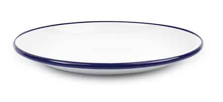 Set of 4 Crow Canyon Home 8" diameter blue rim enamelware small coupe plates. Perfect for sandwiches, desserts, and snacks. Made from high quality carbon steel coated with white porcelain enamel and finished with a blue rim. The plates have a rounded shape with a curled edge. Dishwasher safe. Do not use abrasive cleansers or hard water spot removers on this surface. Enamelware is not intended for microwave use.