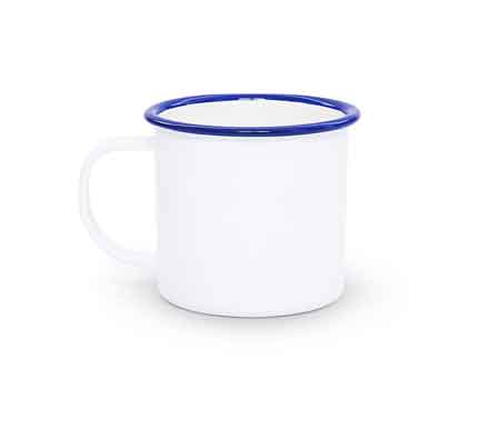 Enamelware set of 4 coffee mugs from Crow Canyon Home. 12 ounce capacity to the rim. 3.5" diameter and 3.25" high. Curled rim like traditional enamelware. Made from high quality steel coated with white porcelain enamel with a blue rim. Durable enough to use every day at home, outside, in the RV or at the camp ground. Dishwasher safe. Do not leave in standing water.