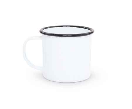 Enamelware coffee mug from Crow Canyon Home holds 12 ounces. It has a 3.5" diameter and stands 3.25" high and has a curled rim. Made from high quality steel coated with white porcelain enamel with a black rim. Durable enough to use every day at home, outside, in the RV or at the camp ground. Dishwasher safe. Do not leave in standing water.