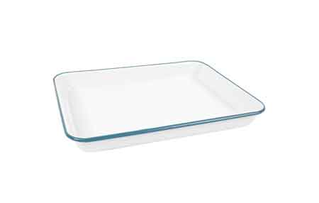 The Crow Canyon Home Small Rectangular Tray Turquoise Rim measures 11.25"L X 9"W. Use it as a baking sheet for cookies, meat tray for the grill, or a serving tray!Dishwasher safe. Do not soak. Oven and freezer safe. Enamelware is not intended for microwave use.High quality steel construction with a baked on white porcelain enamel finish with a colored rim. This naturally non-stick surface compares to glass and makes it easy to clean, too. Provides perfect conductivity and consistent heat for more uniform baking. The interior of the pan is not flat, but slightly concave to help prevent warping when in the oven or to drain away liquids from the center. It has a curled edge. Great for home, campsite, or RV.