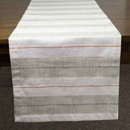 Park Designs Neutral Stripe Table Runner. Measures 15 X 72. Soft neutral stripe on off-white ground. 100% cotton. Made in India. Woven pattern, Hemmed to the back. Machine wash, reshape, dry flat