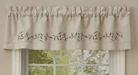 One cotton lined valance from Park Designs with a row of embroidered cotton blossoms.Measures 60 X 14 inches. Decorative hem stitch edge accent. 1.5 inch header and 2 inch rod pocket. Dry clean.