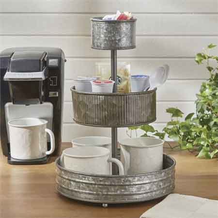 Park Designs 3 Tier Galvanized Organizer. 3 different styled galvanized metal trays for organizing anywhere in the house! Measures 15"H. Trays measure 3.75" X 2 3/8", 7" X 2.75", and 10" X 2.25". Ball feet. Assembly required.
