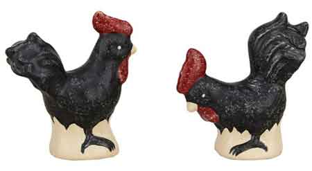 Park Designs Hen Pecked Salt & Pepper Shaker Set. 3.75 inches wide and 2 inches tall. Part of Park Designs Hen Pecked Collection. Refill at bottom. Stoneware