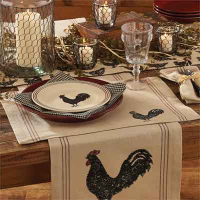 One set of 4 Hen Pecked Collection Striped dinner napkins from Park Designs. 18" square. Hemmed to the back with mitered corners. Lightweight napkins are machine washable. 100% cotton flat woven with a 3 stripe accent to coordinate with the Henpecked Rooster Placemats, sold separately. Made in India.