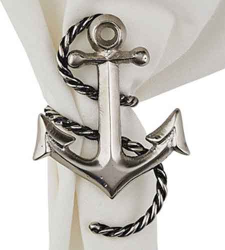 Park Designs Set of 4 Anchor & Rope Napkin Rings. Darkened nickel finish. Nautical theme. Measures 3.25"L X 2.25"W. The braided metal rope becomes the napkin ring.