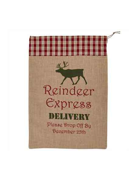 Park Designs Christmas Reindeer Express Santa Sack. Perfect for those hard to wrap gifts! Measures 20 X 30 and has a draw string closure. Can be used year after year. Printed graphic on the front with a cotton plaid border at the top.