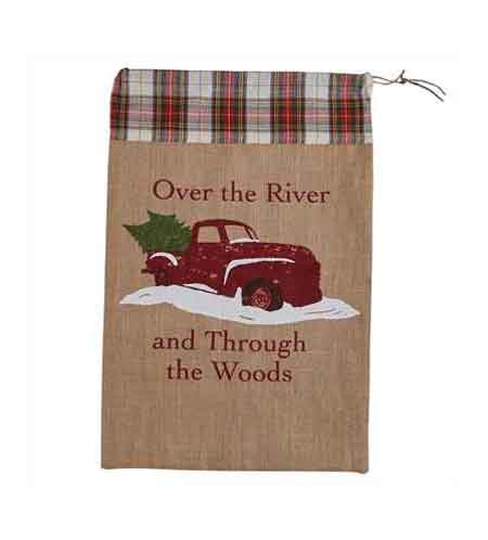 Park Designs Over The River Christmas Santa Sack. Perfect for those hard to wrap gifts! Measures 20 X 30 and has a draw string closure. Can be used year after year. Printed graphic on the front with a cotton plaid border at the top.