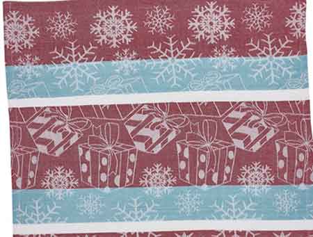 Park Designs Holiday Peppermint Candy jacquard woven dish towel has a bow-topped gift and snowflake design over light blue, white and red stripes. 28" X 19". Made in India. Machine wash in cool water on the delicate cycle with like colors. Towels are 100% cotton and are more absorbent with each washing. Corner tab for hanging. Jacquard weave gives a reverse pattern on the opposite side. Hemmed edges. From Park Designs Peppermint Candy Collection.