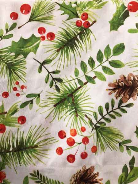 One set of 4 Park Designs Holiday Woodland Quilted Placemats. Printed design for winter or Christmas table settings featuring holly, holly berries, pine branches and pine cones. Designs will vary depending on the cut of the fabric. Quilted with a scalloped binding edge. Self backed. 17" diameter. Machine washable, reshape, lay flat to dry. 100% cotton. Made in India.