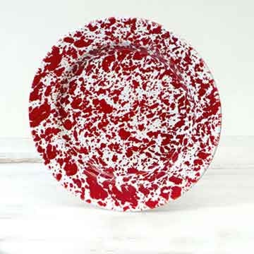 One Crow Canyon Home 10" red marble dinner plate. Crow Canyon Home enamelware is made from high quality carbon steel coated with porcelain enamel in a two coat process that results in a slightly textured surface. This hand finished process means that each piece is unique in color coverage and patterns.It is oven, freezer, and dishwasher safe. Enamelware is not intended for microwave use. Plate has some depth to it and has a curled edge. It stands 7/8" high and the gently sloping rim is 1 3/8" wide.