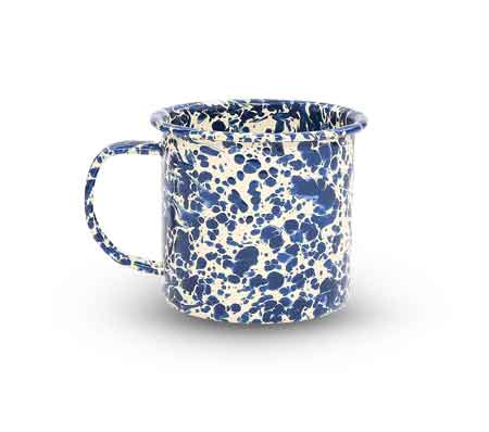 Set of 4 Crow Canyon Home enamelware navy (on a cream base) marble coffee mugs. The mugs hold 12 ounces and have a 3.5" diameter and stand 3.25" high.