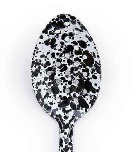 One Crow Canyon Home enamelware 12" perforated spoon for cooking or serving. Holes in the bowl of the spoon help eliminate liquid! Made from carbon steel coated with porcelain enamel in a 2 coat process that results in a slightly textured surface. Dishwasher safe. Do not leave in standing water. Enamelware is not intended for microwave use.