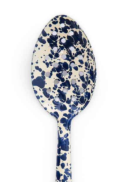 One Crow Canyon Home enamelware 12" perforated spoon for cooking or serving. Holes in the bowl of the spoon help eliminate liquid! Made from carbon steel coated with porcelain enamel in a 2 coat process that results in a slightly textured surface. Dishwasher safe. Do not leave in standing water. Enamelware is not intended for microwave use.