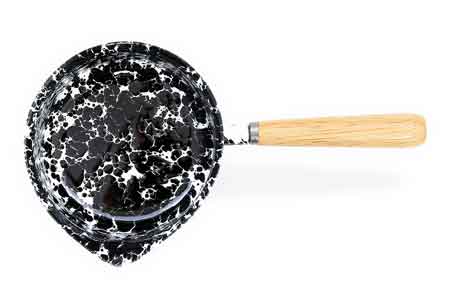 Crow Canyon Home small black marble enamelware sauce or gravy pan. 2 cup capacity. A small, 22 ounce pot with spout and wooden handle (some assembly required) perfect for heating and serving sauces and gravies.
