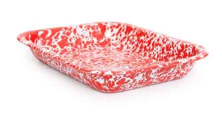 Crow Canyon Home Red Marble Open Roaster, 8" X 10.5". Great for small casseroles or desserts! Yum! This pan has a curled edge, slightly sloping sides and rounded corners.