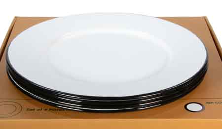 One boxed set of 4 Golden Rabbit Enamelware Glampware rolled edge black rim 10.5" Dinner Plates. Unlike traditional camping tinware, Golden Rabbit's new rolled edge Glampware is developed using their signature thick gauge steel and high quality porcelain enamel, making the Glampware durable, scratch resistant and naturally non-stick with a remarkably long lasting finish. Glampware bowls and mug sets are sold separately. Dishwasher safe, not intended for microwave use.