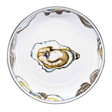 Set of four 10" diameter deep plates with stainless steel rims from the Golden Rabbit Oyster Collection. Perfect for pasta, rice, salads and more The plate has curved sides and stands 1.5" high.