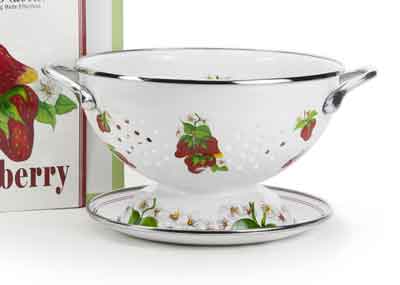 Golden Rabbit Enamelware gift boxed set of a 1.5 quart colander and 8" drip plate with Cherry graphics. The colander and plate have stainless steel rims. The colander has stainless steel handles. Dishwasher safe. The colander has an 8.6" diameter, overall width with handles is 11". The colander stands approx 5.5" tall with a 6" diameter base.