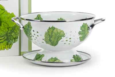 Golden Rabbit Enamelware gift boxed set of a 1.5 quart colander and 8" drip plate with Lettuce graphics. The colander and plate have stainless steel rims. The colander has stainless steel handles. Dishwasher safe. The colander has an 8.6" diameter, overall width with handles is 11". The colander stands approx 5.5" tall with a 6" diameter base.